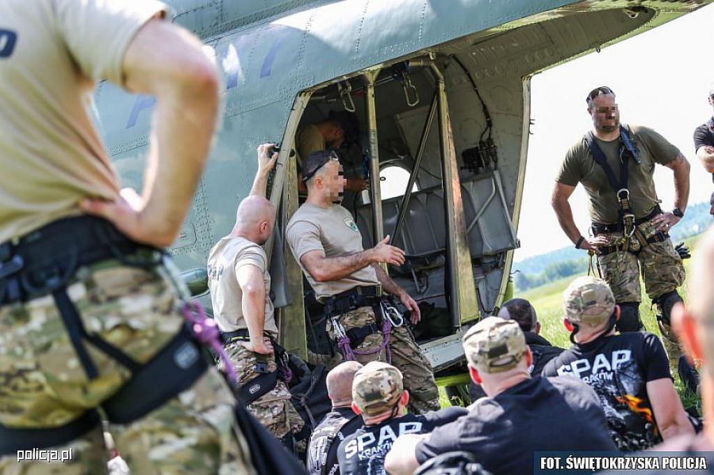 Uczestnicy rozpoczęli dziś szkolenie od wspólnej odprawy, na której szczegółowo omówiono wszystkie jego elementy. Później przenieśli się do podkieleckiego Masłowa, gdzie przy użyciu policyjnego śmigłowca Mi-8 przeszli do praktyki. Jednak najpierw bardzo szczegółowo omówiono wszystkie zasady bezpieczeństwa, a także udzielono dokładnego instruktarzu. Kolejno, każdy ćwiczył zjazd na linie osobistej z różnych wysokości, a następnie zjazd na linie desantowej tzw. szybkiej. W kolejnych dniach uczestnicy będą doskonalić swoje umiejętności na różnych obiektach i w różnym terenie.