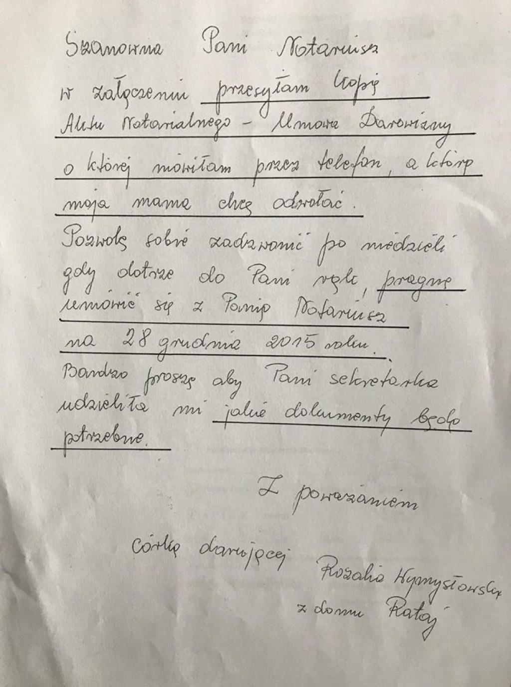 - 18 grudnia 2015 roku wysłałam z Kołobrzegu pismo do pani notariusz Sabiny Paprockiej, która ma kancelarię przy ul. Narutowicza 9 w Poddębicach, niedaleko Uniejowa. Poprosiłam ją, by przygotowała dokumenty w celu odwołania darowizny i by całość z powrotem wróciła do babci Jadwigi. Pani notariusz mnie, jednak, oszukała – przekazuje Pani Rozalia.