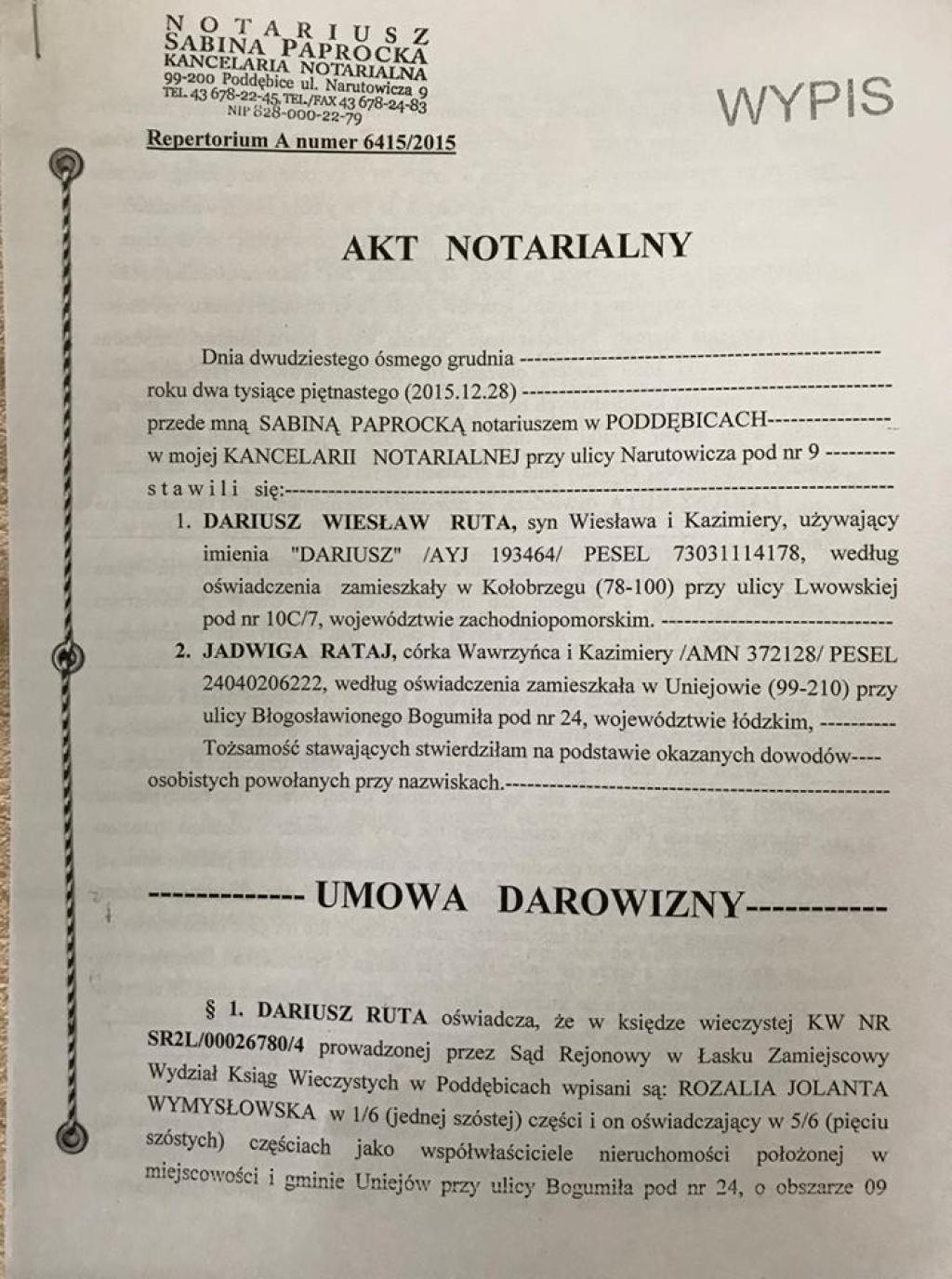Z dokumentów wynika, że Rozalia Wymysłowska stawiła się w kancelarii notarialnej 28 grudnia 2015 razem z babcią Jadwigą. Stawił się też Dariusz Ruta. Ale zamiast cofnięcia darowizny, co było wolą babci Jadwigi, notariusz Sabina Paprocka przeprowadziła akt darowizny ze strony Dariusza Ruta na rzecz babci Jadwigi. I całość rzeczywiście znów stała się jej własnością. Ale z koszmarnymi konsekwencjami tej formalnej zmiany!