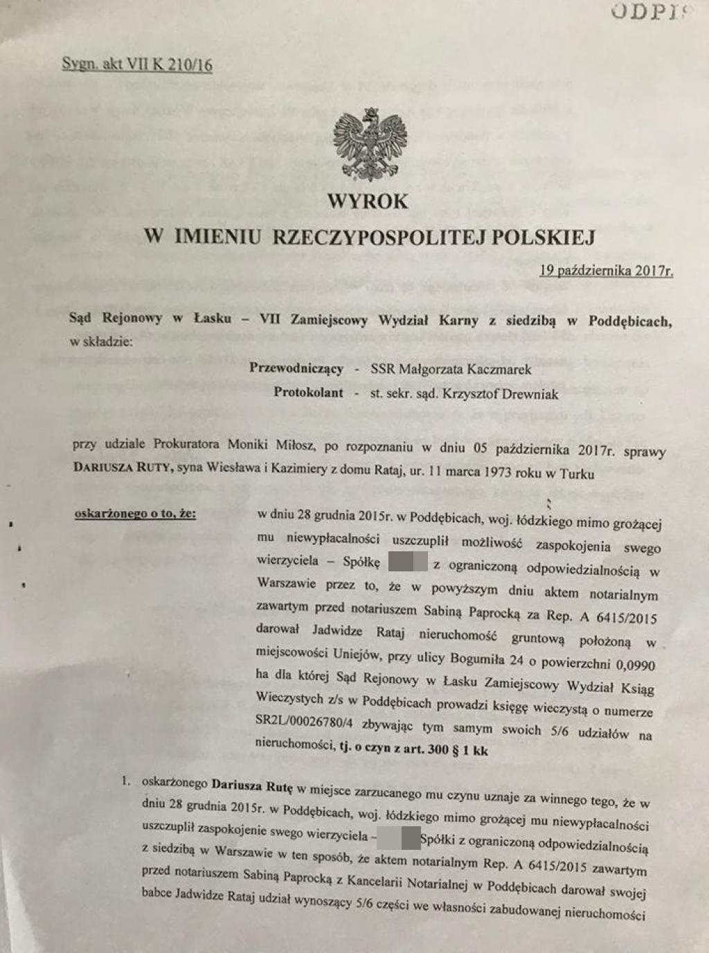 Okazuje się, że być może miała świadomość pokrzywdzenia również firmy z Warszawy poprzez sporządzany przez siebie akt. Dotarliśmy do wyroku sądu z 19 października 2017 roku uznającego winnym Dariusza Rutę przez Wydział Karny wyrządzenia szkody firmie właśnie poprzez wykonanie świadomie, aktu darowizny w kancelarii notariusz Sabiny Paprockiej na rzecz swojej babci Jadwigi.