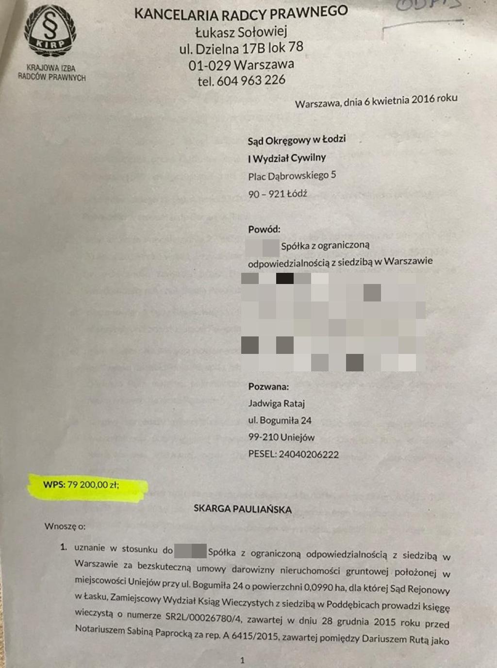 A "Skarga Pauliańska" polega na tym, że wnosząca ją firma z Warszawy zażądała unieważnienia tej własnie darowizny sporządzonej 28.12.2015 roku u notariusz Sabiny Paprockiej..