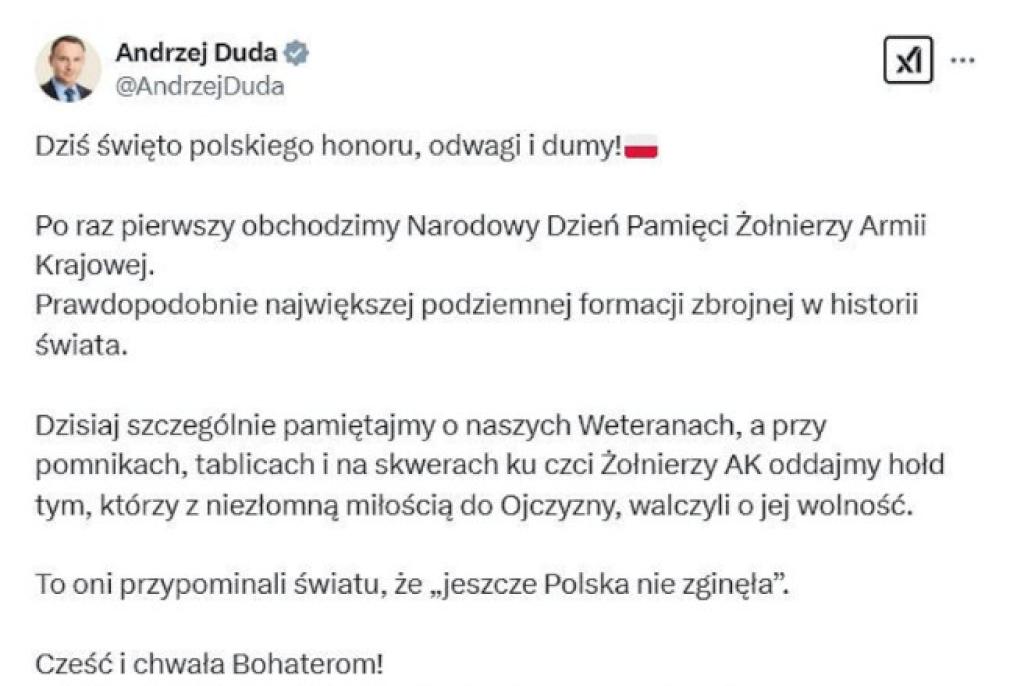 Wcześniej na platformie X Prezydent zachęcił do uczczenia tego dnia w lokalnych miejscach pamięci: „Dzisiaj szczególnie pamiętajmy o naszych Weteranach, a przy pomnikach, tablicach i na skwerach ku czci Żołnierzy AK oddajmy hołd tym, którzy z niezłomną miłością do Ojczyzny, walczyli o jej wolność” – napisał.