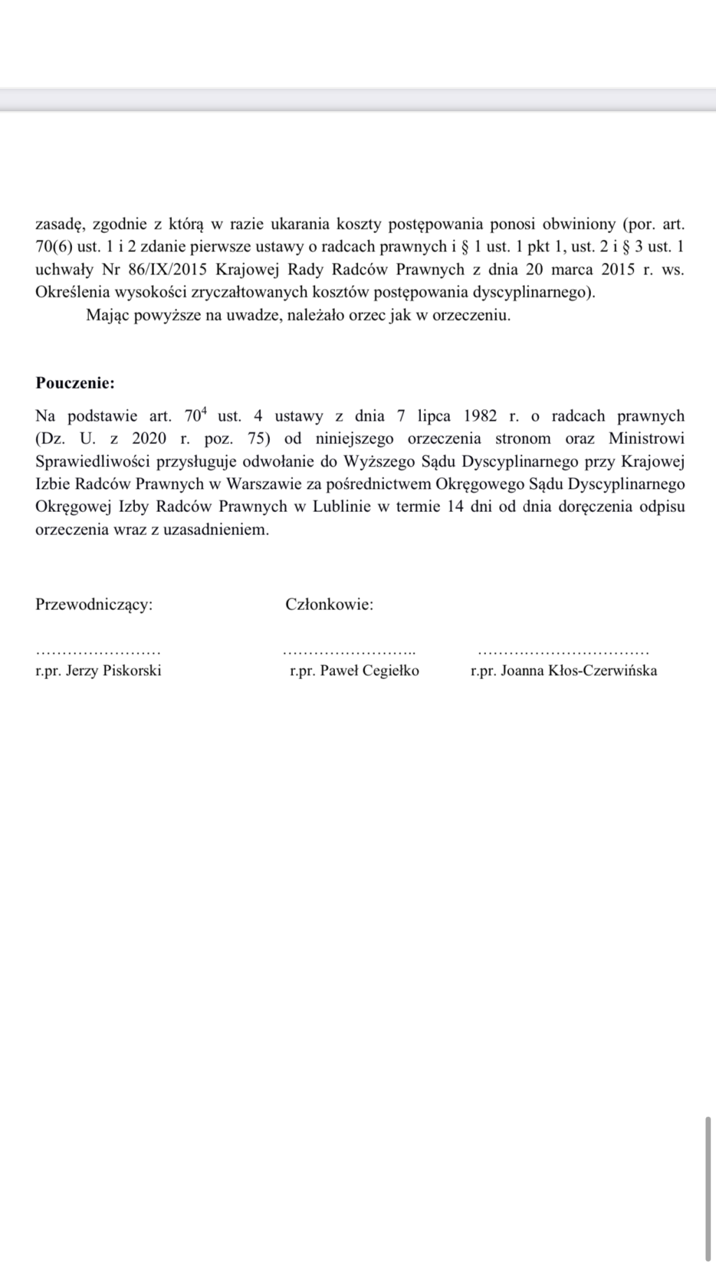 Dodatkowo Sąd Dyscyplinarny Okręgowej Izby Radców Prawnych w Lublinie pozbawił Sekretarza Gminy prawa wykonywania zawodu radcy prawnego przez dwa lata. Właśnie za namawianie Wiesława Księżuka do popełnienia przestępstw. Tę decyzję dołączamy do niniejszego tekstu.